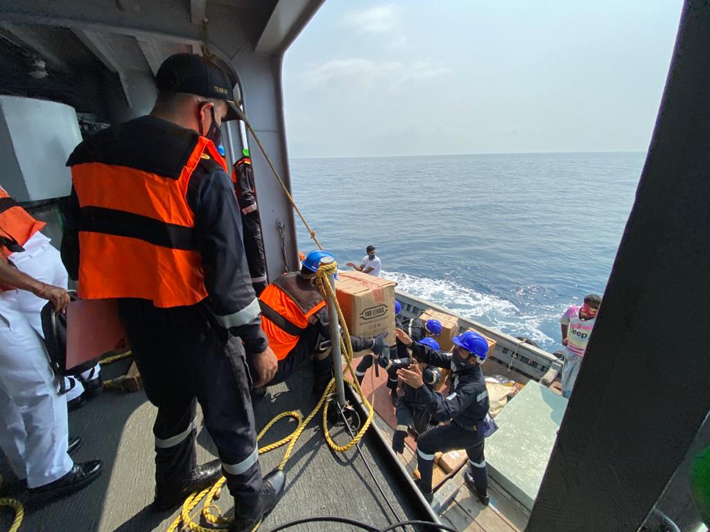As part of the nation’s fight against COVID 19, Indian Navy ships under Headquarters, Southern Naval Command at Kochi are progressing with the mission of OXYGEN EXPRESS in order to render support to the local administration of the Union Territory of Lakshadweep (UTL). On 25th April, INS Sharda, based at Kochi, undertook transfer of essential medical supplies to the capital of UTL, Kavaratti. The stores consisted of 35 Oxygen cylinders, Rapid Antigen Detection Test (RADT) kits, Personnel Protective Equipment (PPE), masks and other items to fight the COVID 19 pandemic. The disembarkation of stores was coordinated by personnel from INS Dweeprakshak at Kavaratti. The ship then continued with her mission to the island of Minicoy for disembarkation of Oxygen cylinders and medical supplies.
