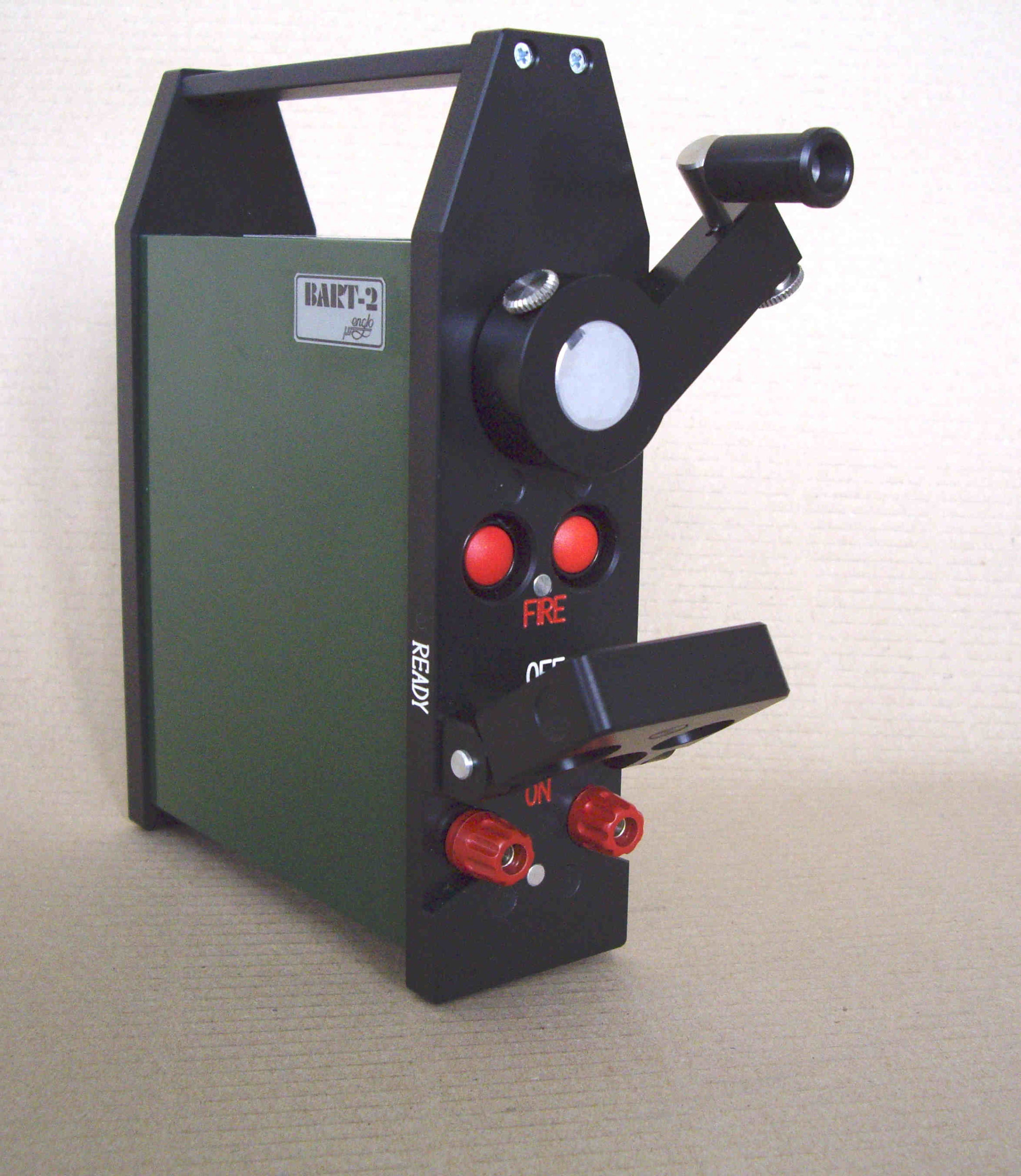 For the military, we now produce blasting machines either with batteries or with hand generators; clackers; detonator line ohmmeters and blasting machine testers. Our smallest blasting machine is a clacker, PONGO, having a weight of a mere 150 g and carrying out more than 1,000 blasts without any feeding.