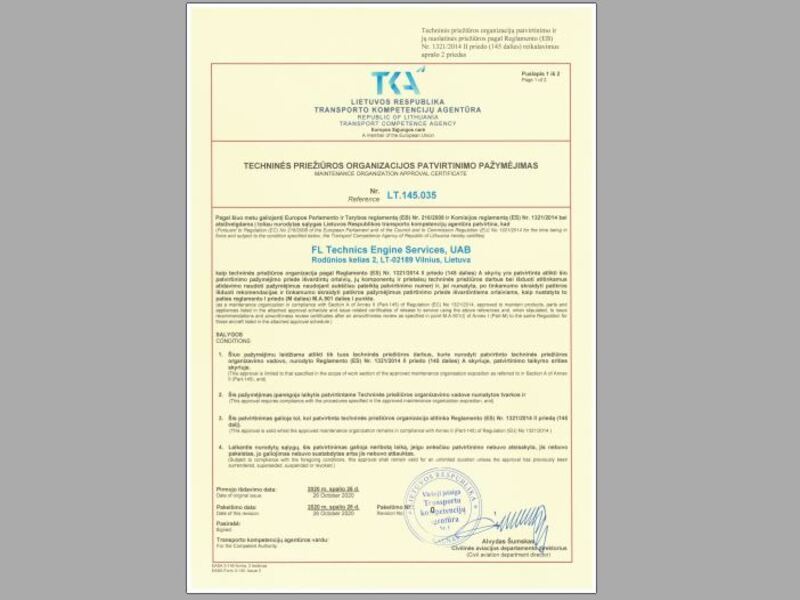 FL Technics, Maintenance, Repair, and Operations (MRO) organization, announced that its daughter company FL Technics Engine Services has received Part-145 approval from the Transport Competency Agency of Republic of Lithuania...